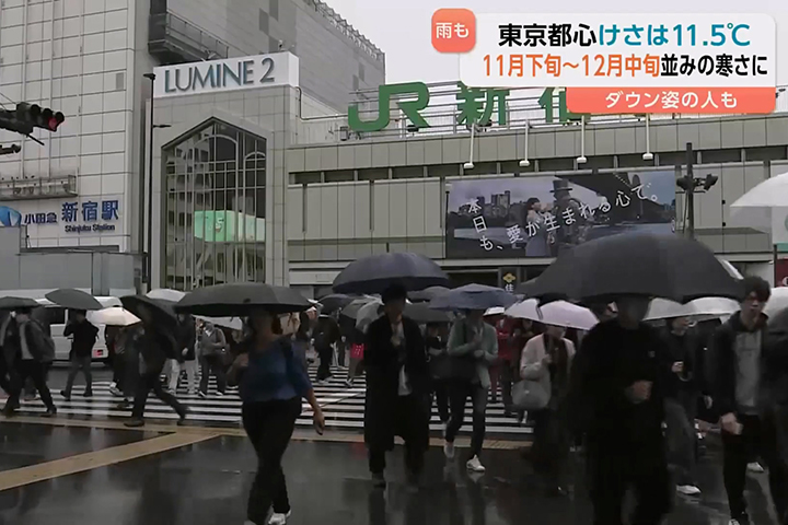 清晨東京市中心最低氣溫降到11.5度,比起早一天低了2度以上,創下本季新低,之後氣溫也沒有明顯回升,白天的感覺有如11月下旬到12月中旬那麼寒冷。這主要是受秋雨前線滯留於日本南部影響,東日本至西日本的太平一側出現冷雨,因此各地紛紛感受到季節一下子往前推進。