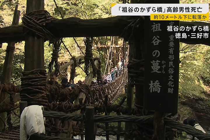 10月30日下午3時過後,祖谷蔓橋的收費所職員向消防通報,表示有人倒地呼叫也沒反應。倒地者為一名約70多歲男性,被發現時在橋下約10公尺的河岸,頭部流血,當場確認死亡。該男子是與數人同行一起前來觀光,警方現正以懷疑不慎從橋上墜落為方向,進一步調查詳情。