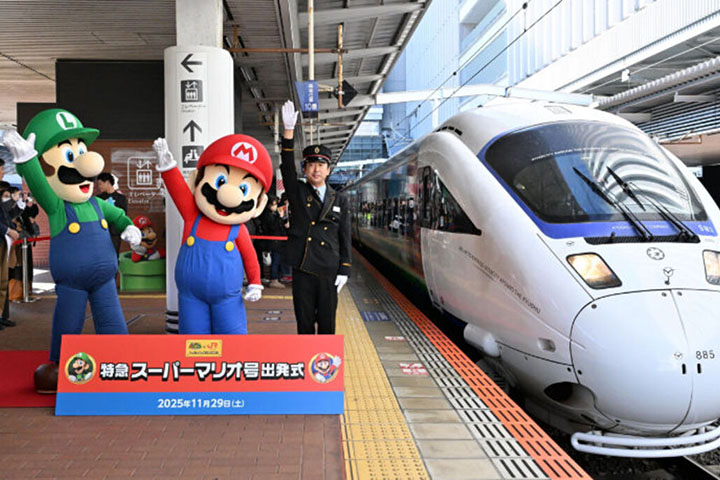 【交通】超級瑪利歐特急列車九州登場!11月29日,JR博多站出現以超級瑪利歐角色作塗裝的特急列車,名為「SUPER MARIO TRAIN」,這天在該站舉行了發車儀式,瑪利歐及路易吉也有登場,現場感覺非常歡樂。
