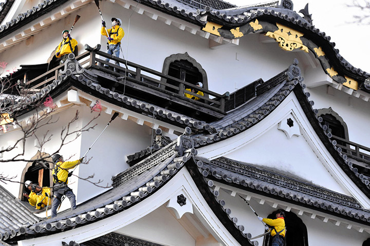 【活動】彥根城天守閣大掃除以漂亮姿態迎接新一年!滋賀縣彥根市的國寶彥根城,12月11日進行歲末例行的「拂拭積塵」,以清除今年累積的污垢。清晨職員登上約21公尺高的天守閣,戴上安全帽繫上安全繩,使用特製掃帚,細心地清掃屋簷下積累的灰塵。