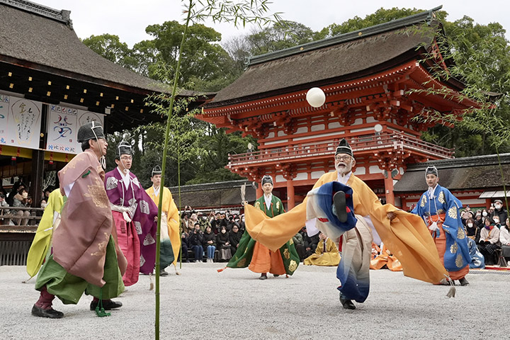 【活動】京都下鴨神社「初蹴鞠」看古代足球技巧!京都世界遺產下鴨神社於1月4日進行新春恆例的「蹴鞠初」,穿上平安時代的貴族裝束,被稱為「鞠人」的8名男女,在長闊10公尺的「鞠庭」圍圈踢用鹿皮及馬皮縫製直徑約20公分蹴鞠,只用右腳一邊互傳一邊叫喊,吸引大量當地及海外遊客欣賞。