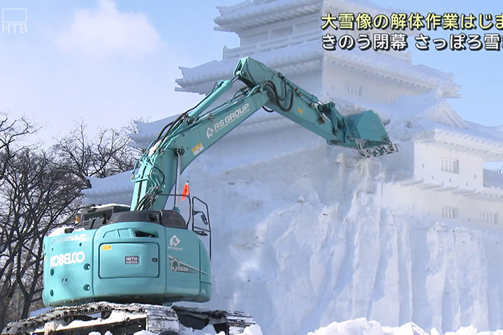 【活動】札幌雪祭曲終人散華麗大型雪像瞬間被毀現場!北海道冬季最人氣祭典「札幌雪祭」已於2月11日落幕,2月12日早上大通會場開始進行大型雪像的拆除作業。在大通西8丁目會場,早上8時半就有兩部重型挖土機把精緻的「會津鶴城」雪像推倒。