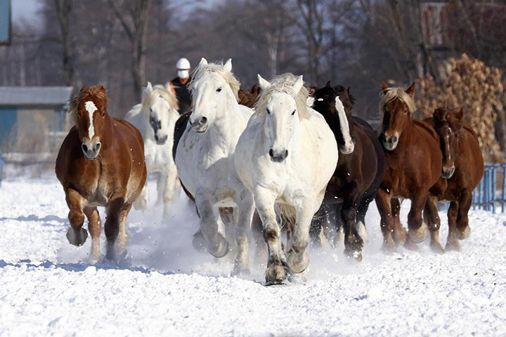 【活動】北海道雪地馬匹奔馳震撼現場!位於北海道音更町的家畜改良中心十勝牧場,現正進行「馬追運動」,讓即將臨產的馬匹奔跑鍛鍊,牠們體重可達1公噸,鼻子吐著白霧,在雪地上奔馳,期間激起很多雪花。