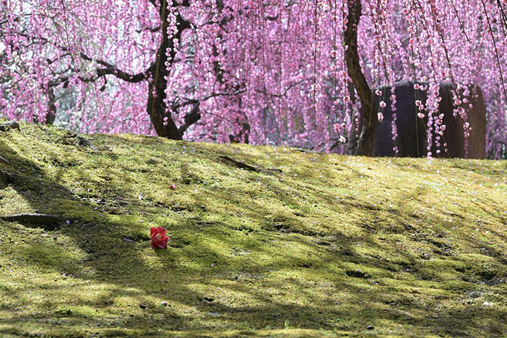 現時當地正舉行「枝垂梅與山茶花祭」,代表那裡除了梅花還有山茶花值得欣賞。整個城南宮有150個品種共約400株山茶花,現時是鮮紅色「城南椿」滿開的時候,最漂亮的風景是山茶花落在草地上,後方有枝垂梅作背景,身處京都的朋友去看看吧!祭典至3月22日。