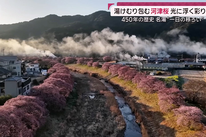 重點是流經溫泉的河川兩岸種植了約800株河津櫻,最近已來到滿開期,從無人機的高空角度所見,感覺和河津町很像,但明顯人少很多,又有溫泉的湯煙作背景,似乎是欣賞河津櫻的秘點!當地的櫻花祭至3月10日,期間晚上會有亮燈,帶來不一樣的美景,有興趣的朋友,把握機會前往吧!不過人少的代價就是沒有鐵道直達,要在下田市轉巴士前往。