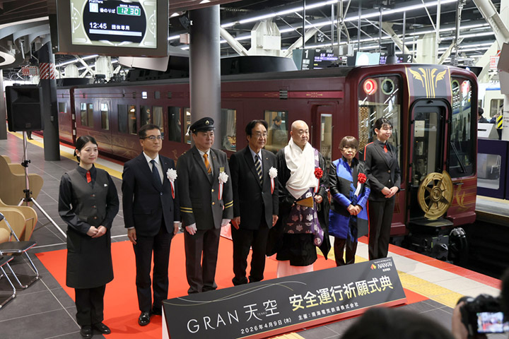 4月9日南海電鐵在難波站全新啟用的「0號月台」上,正式公開了新型觀光列車「GRAN天空」的內裝與全貌。月台本身就充滿巧思,木質長椅造型獨特,天花板帶有優雅的曲線設計,是今年春天才剛落成的嶄新空間。當天的發表儀式上,來自高野山的真言宗僧侶到場為列車祈願行車安全,同場還有為乘務員制服操刀設計的是大阪出身國際級設計師小篠順子。