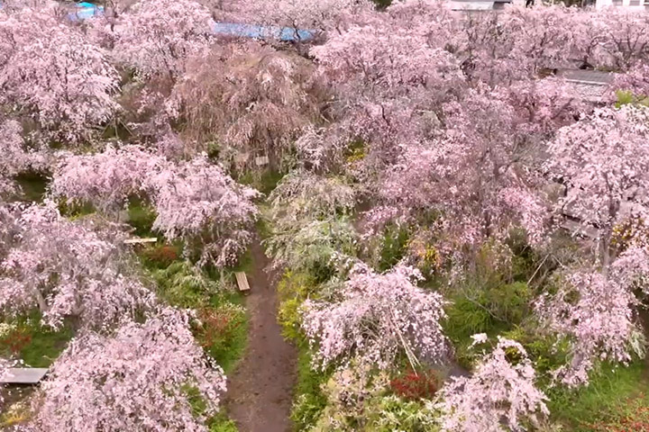 原谷苑四千坪的園區內,約四百棵二十多種櫻花樹同時盛放,再加上近一千棵的各色季節花卉交織其間,整個空間被填滿。這裡的花不是大家常見的整齊排列,而是以近乎野生的不受拘束的方式恣意生長,層層疊疊、高高低低地將你包裹在花的漩渦之中。影片中可以看到遊客忍不住驚呼:「太不可思議了!」「這已經脫離現實了,和一般的賞花完全不同。」
