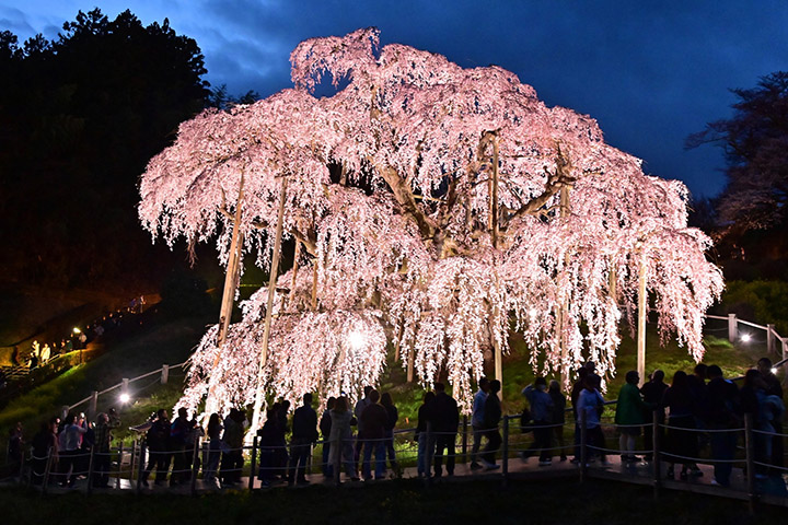 今年三春瀧櫻在4月8日迎來了滿開。春日暖陽之下大批遊客湧至欣賞。到了夜晚,燈光從樹下向上投射,將整棵樹從黑暗中托舉出來,白天那種溫柔的薄紅在人工光源下轉化為帶神秘感,流瀉而下的花枝彷彿在暗夜中發著微光,夢幻到讓人不確定自己是否還站在現實世界裡。